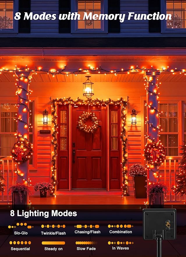- 【8 Lighting Modes】The outdoor solar string light has an on/off button and a mode button, providing 8 different modes: Combination Mode, Wave Mode, Sequence Mode, Slo-glo Mode, Chase/Flicker Mode, Slow Fade Mode, Flicker/Flicker Mode and Steady On Mode. Choose different modes to meet your various needs. Outdoor solar blinking light also has a built-in memory chip to save the last mode setting.