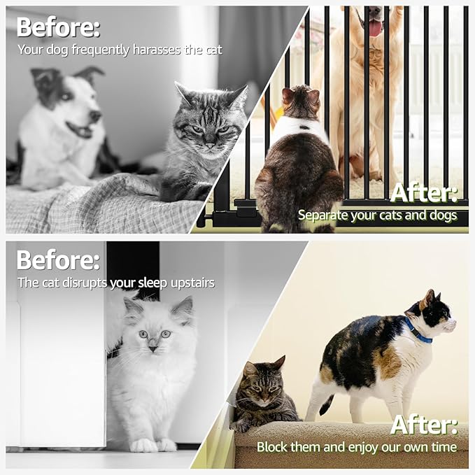 - 【Extra Tall Cat Gate】This tall cat door is specifically designed to prevent cats from jumping over. It features adjustable height and width. The width can be adjusted from 28.3 to 33 inches, and the height ranges from 44.5 to 78.8 inches, allowing you to customize it according to your needs. The space between the tubes is 1.4", ensures that pets can not drill out from the gate or stuck their heads between it.