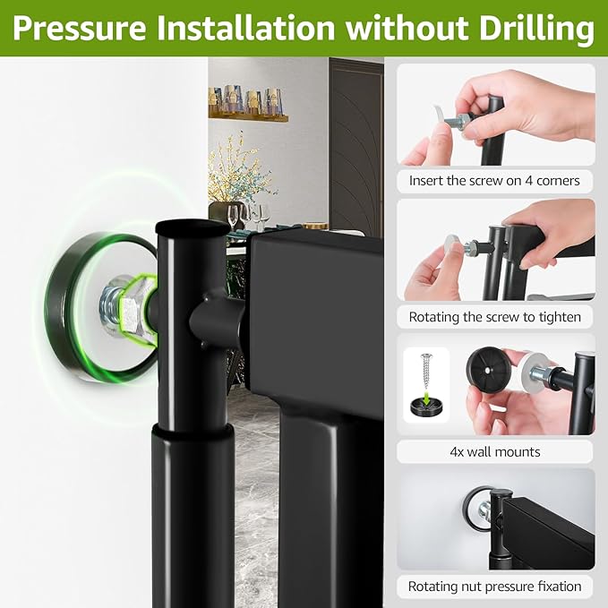 - 【 Easy Installation 】 The pressure mounting structure can securely fasten to the door frame without the need for drilling, ensuring protection to the wall. The adjustable support rods can flexibly lower or raise to accommodate different heights of door frames. The adjustable width feature further enhances its flexibility in installation and usage.