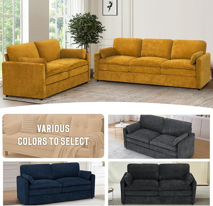 69" Chenille 2 Seats Sofa with 2 Pillows, Modern Upholstered Sofa with Deeper Seats, Comfy Sofa with Thickened Cushions for Living Room, Apartment, Yellow