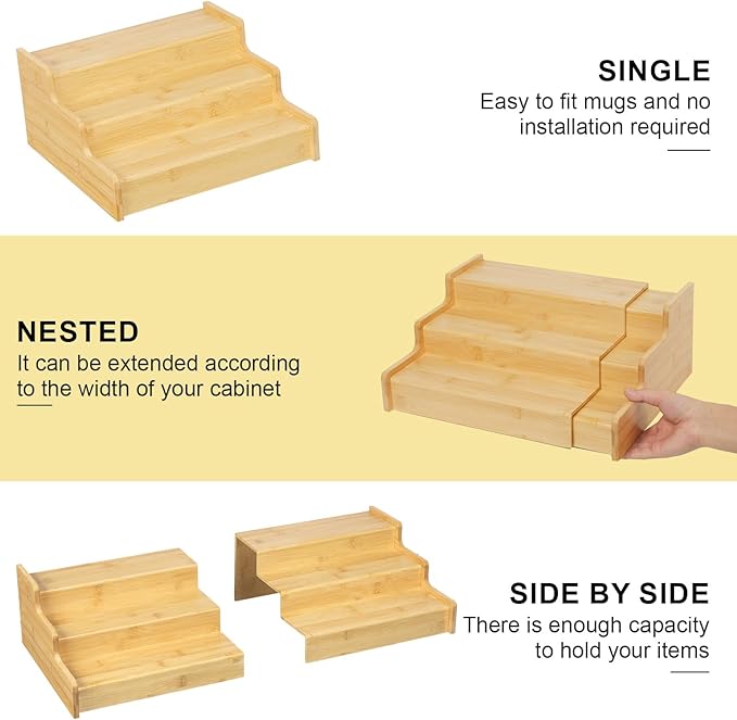 3-Tier Expandable Bamboo Mug Holder For Countertop Coffee Cup Holder Display Mug Organizer Mug Rack for Coffee Bar Organizer Mug Shelf for Cabinet for Kitchen, Home