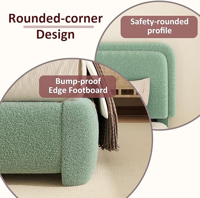 Full Boucle Platform Bed Frame with Height Adjustable Headboard, Modern Upholstered Cloud Bed, Sleek Curved Design, No Box Spring Needed, Easy Assembly, Noise Free,Green
