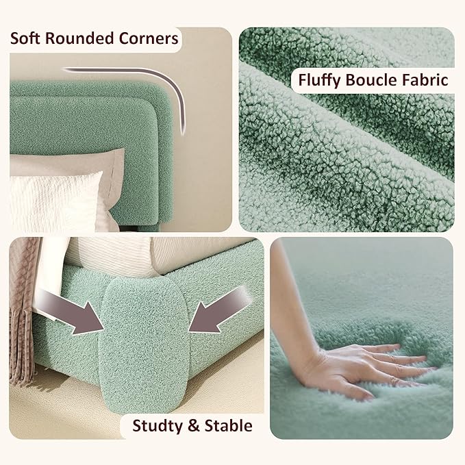 Queen Boucle Platform Bed Frame with Height Adjustable Headboard, Modern Upholstered Cloud Bed, Sleek Curved Design, No Box Spring Needed, Easy Assembly, Noise Free, Green