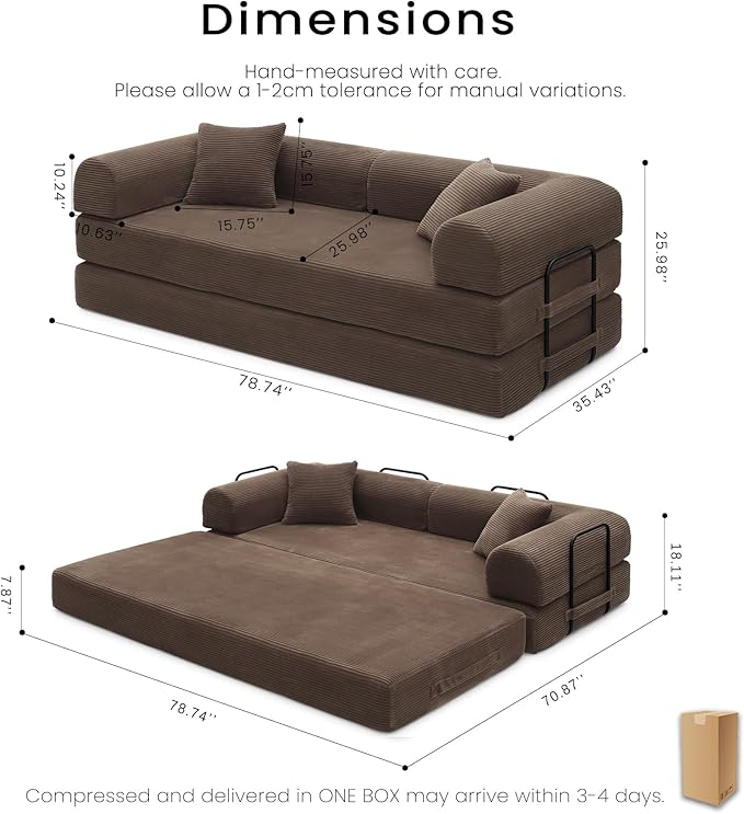 - No Assembly Required-This compressed sofa comes packed in a box for easy transport, allowing it to pass effortlessly through narrow hallways and doorways. No tools or assembly are required—simply unfold and start enjoying it right away. It will return to its optimal shape within 72 hours, and any wrinkles during the recovery process can be smoothed out with a steam iron.
