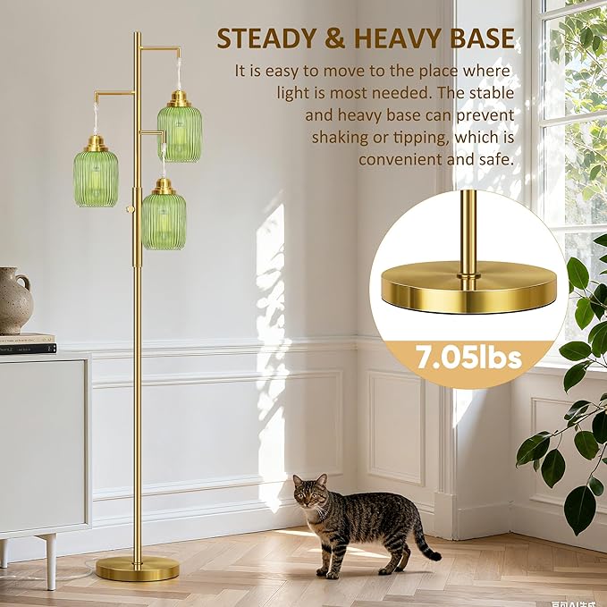 Rottogoon Dimmable Gold Floor Lamp for Living Room- 3 Light Green Glass Floor Lamps, Vintage Brass Tree Floor Lamps with 3X 6W LED Bulbs, Modern Standing Tall Lamp for Bedroom, 68", Gold & Green Glass