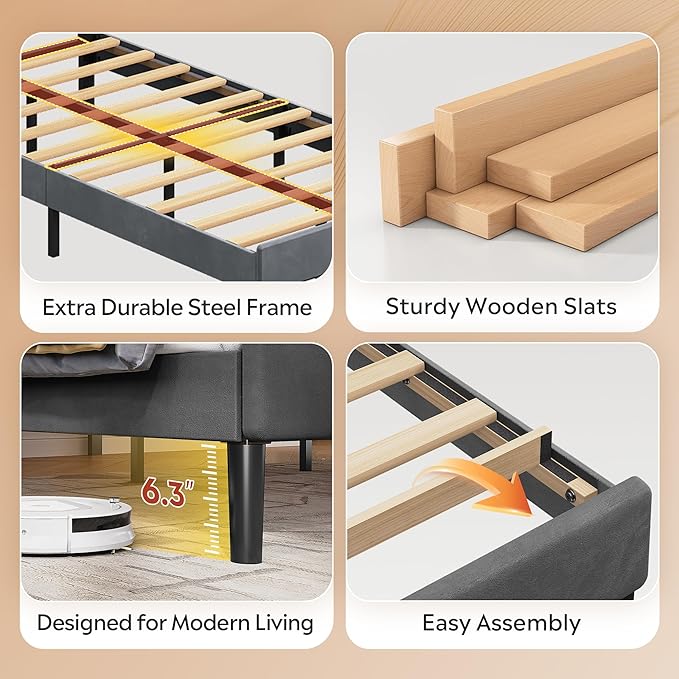- 【No Box Spring Needed】 Designed with strong wood slats support, this bed frame requires no box spring—stable, durable, and cost-saving.