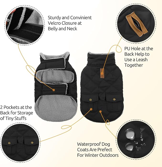 - CUTE STORAGE POCKETS AT THE BACK - The stylish quilting pockets at the back are eye-catching. It is easy to store some snacks, garbage bag or the leash to the storage pockets at the back of the dog jacket.