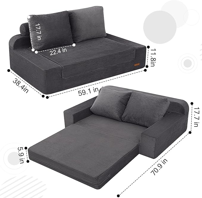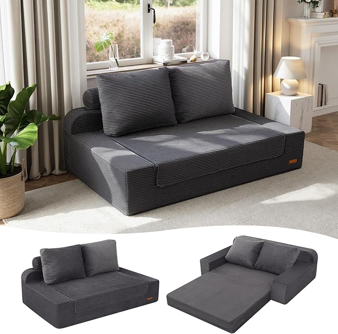 COMAX Convertible Sofa Bed Queen, Folding Floor Couch Corduroy Fold Out Couch Bed Sleeper Mattress with Back Pillows, Boneless Pull Out Loveseat Comfy Futon Lounge for Living Room Bedroom, Grey