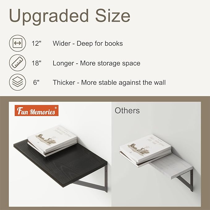 - 【12 INCH DEEP FLOATING SHELF】This extra deeper and wider wall shelves are 12 inches in depth and 18 inches in length instead of the regular narrow floating shelves, you can put photos, pictures, DVD players, videos, books, toys, and some other knickknack on this beautiful display wooden shelf.