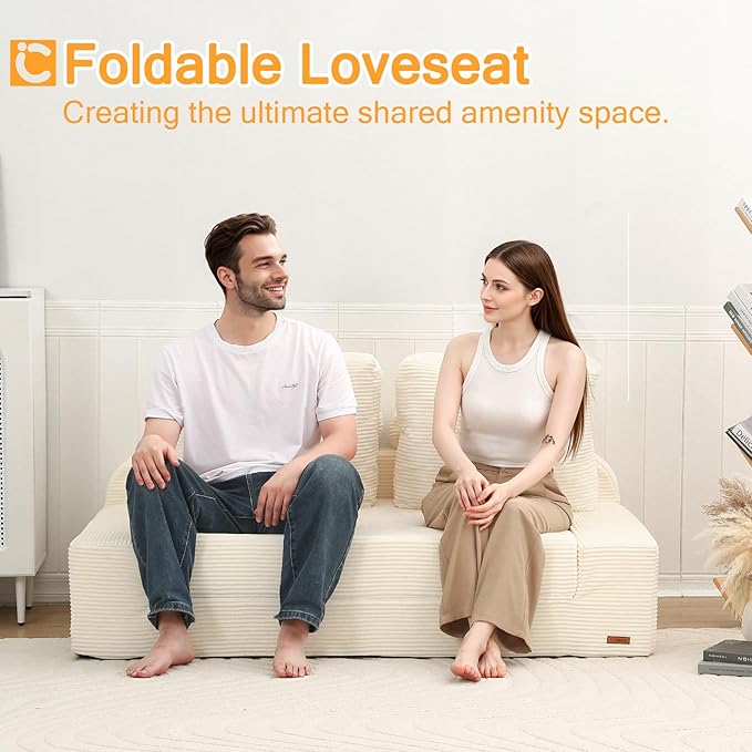 COMAX Convertible Sofa Bed Queen, Folding Floor Couch Corduroy Fold Out Couch Bed Sleeper Mattress with Back Pillows, Boneless Pull Out Loveseat Comfy Futon Lounge for Living Room Bedroom, Beige