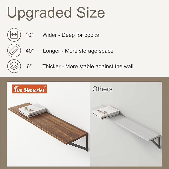 Fun Memories 40 Inch Floating Shelves, 10 Inch Deep Wall Shelf, 40 x 10 Floating Shelf Set of 2, Wood Floating Shelf Wall Mounted, Large Kitchen Living Room Bedroom Storage Shelves, Walnut