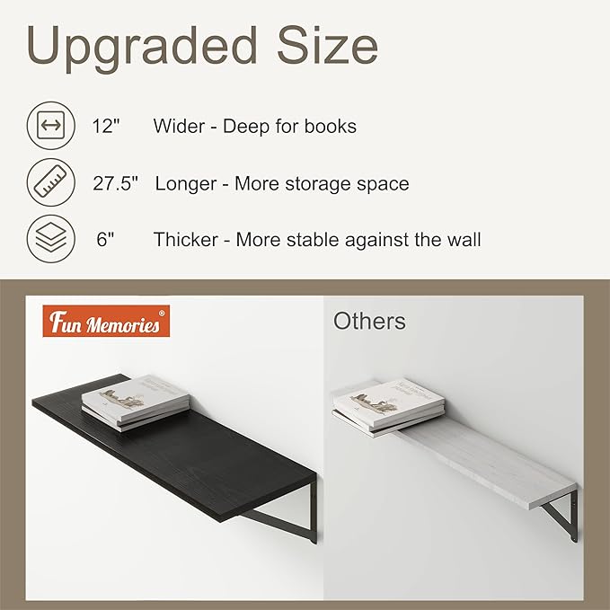 - 【12 INCH DEEP FLOATING SHELF】This extra deeper and wider wall shelves are 12 inches in depth and 27.5 inches in length instead of the regular narrow floating shelves, you can put photos, pictures, DVD players, videos, books, toys, and some other knickknack on this beautiful display wooden shelf.
