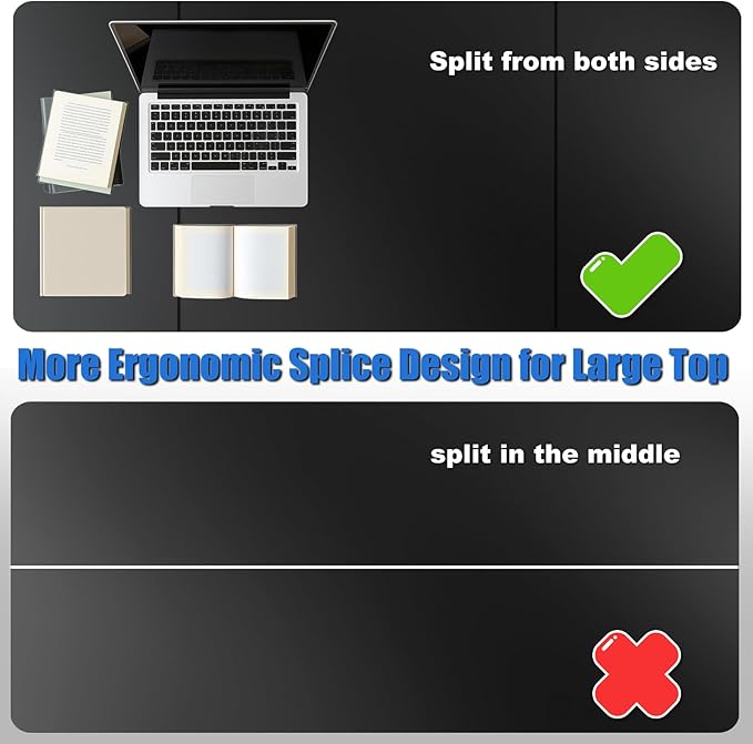 - 【Spacious & Wide Workspace Desktop】63''X23.6'' wide tabletop provides ample space without any holes on the surface. Splice desktop with 3 boards. Left, right and the middle, different with other sit stand desks spliced in the center. The middle piece is a 40 inch whole piece working area. Spacious workstation is large enough for dual monitors, printers, and other office essentials.