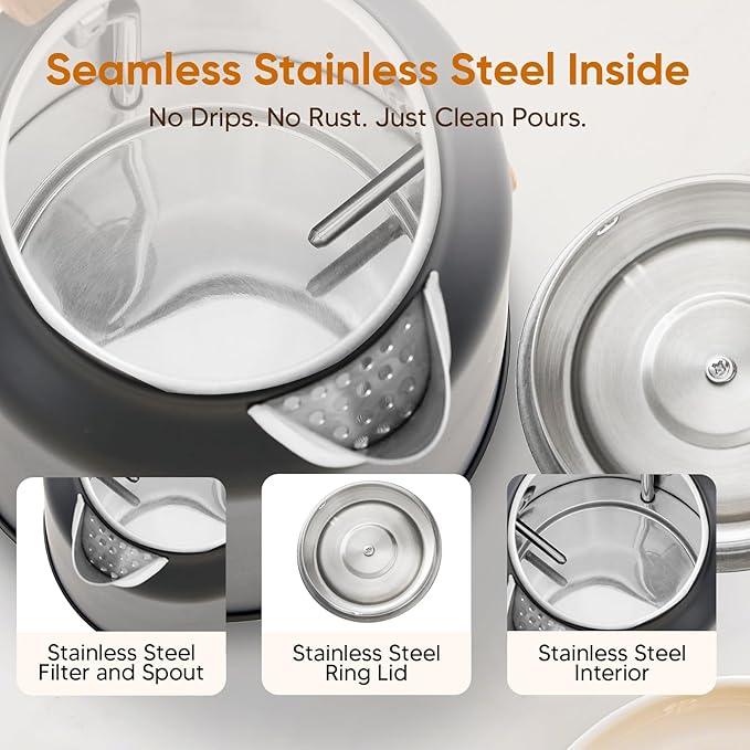 • 【Safe & Durable 304 Stainless Steel】 – Crafted with food-grade steel, this hot water kettle electric ensures no plastic touches water. Its seamless design prevents leaks, while the stainless spout filter keeps every pour pure and smooth. Built to last, this kettle delivers confidence with every use.