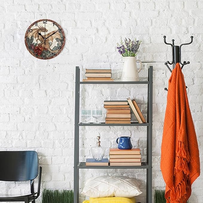 Bolaz Wall Clocks Decorative Bedroom Silent Living Room Desktop Dragon Flowers Tabletop Shelf Clocks Round Battery Operated 10 Inch Non-Ticking