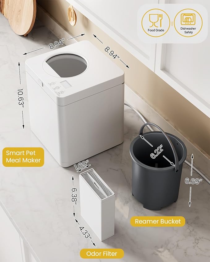 - Auto 5-in-1 Multi-Function:Pet meal maker innovative appliance automates 5 key steps,chopping ingredients,slow-cooking,mixing during the process,self-cleaning and time-all in one compact unit. Easily prepare fresh,nutrient-rich meals tailored to your pet needs. Just simply add pre-chopped ingredients (small chunks) into the machine,load,press start,and serve,you can produce grains in various forms such as clumping dog jerky,dry food,wet food,meat meal,wet cat food.