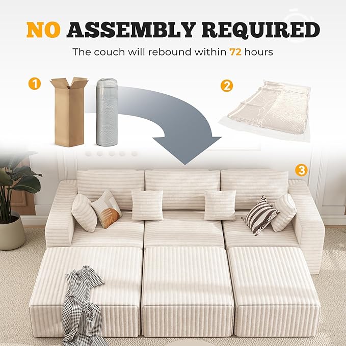 - 【No Assembly Required】Say goodbye to furniture assembly nightmares with our modular cloud couch! Simply unpack, lightly pat the pieces, and allow the couch to regain its full shape within 72 hours. Perfect for large spaces, apartments, houses and anyone who needs a quick and easy furniture solution. Enjoy a hassle-free setup and the immediate comfort of your new sofa!