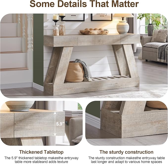 - Easy Assembly for Farmhouse Entryway Table: Pre-labeled parts and tool-free hardware simplify setup for this entryway table with drawers. Wipeable surfaces and responsive support ensure hassle-free maintenance, preserving its farmhouse appeal.