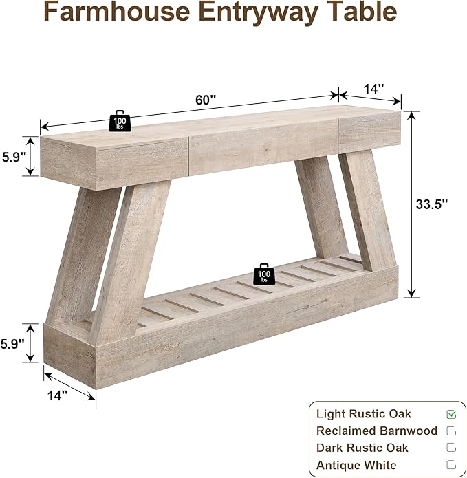 60" Farmhouse Entryway Table with Drawer, Wooden Hallway Foyer Table with Heavy Duty Base(Light Rustic Oak)