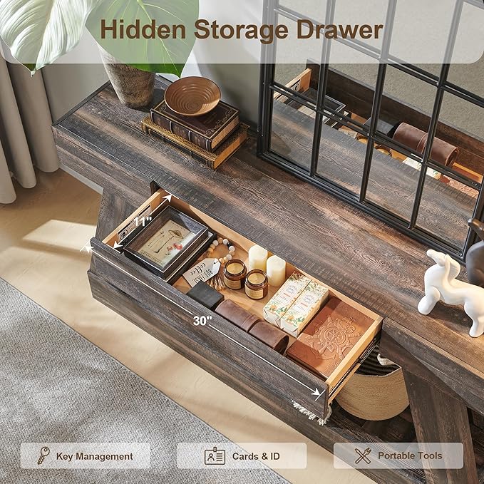 - Multi-Zone Console Table with Rustic Versatility: Functioning as a sofa table or hallway accent, it transitions seamlessly between entryways, living rooms, and dining areas. Use it behind couches for décor displays or as a behind couch table for organizing remotes and books.
