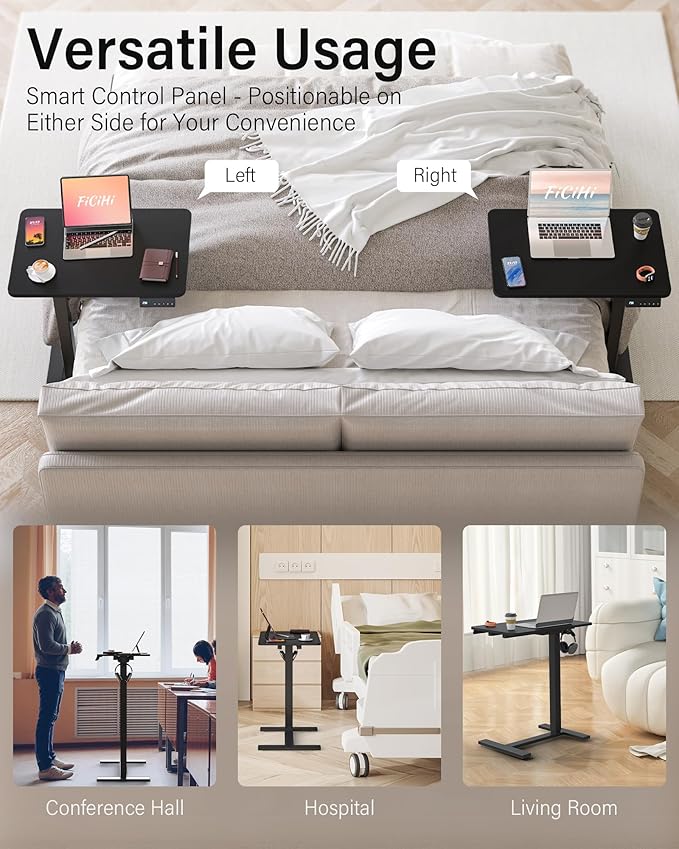 - 【Quiet & Electric Adjustable Height】FiCiHi Electric Overbed Bedside Table features a hidden brushless motor for whisper-quiet operation (<43dB). Adjust the height from 28" to 46.9" with 3 memory presets for a seamless work or relaxation experience.