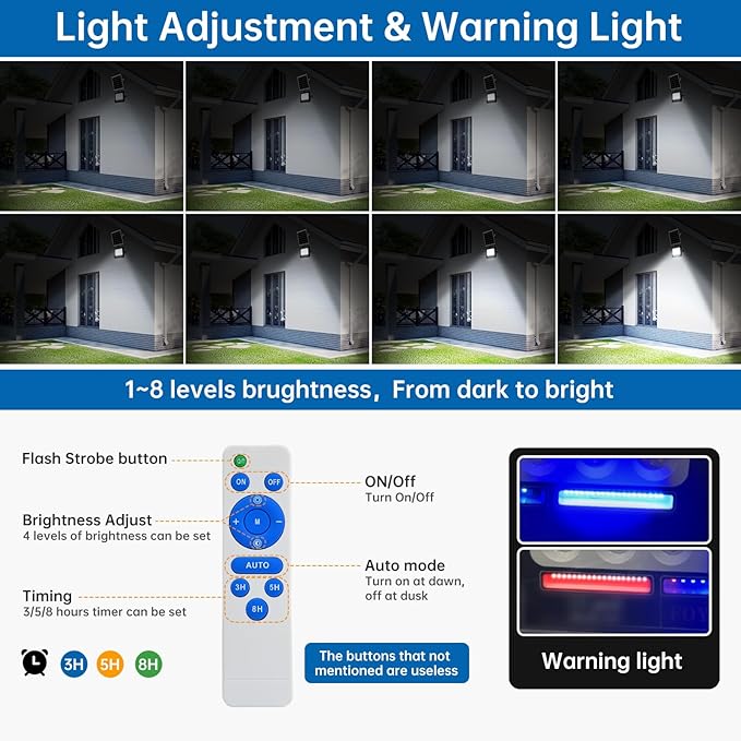 - 【Smart Remote Control + Auto Light Sensor + Flash Strobe】This outdoor battery operated strobe with remote allows wireless switching of lighting modes, remote on/off, timing, and dimming. The light sensor activates at dusk and turns off at dawn for full automation. Integrated red/blue flashing strobe can be manually triggered for high-visibility warning. Ideal for high lumen solar spot lights, this solar panel light offers energy-efficient security as exterior solar lights for house.
