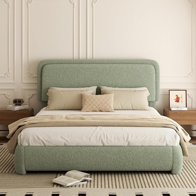 Queen Bed Frame, Teddy Velvet Boucle Bed Frame with 43.3"/45.3" Adjustable Upholstered Headboard, Rounded Corners, Mattress Foundation, No Box Spring Required, Green