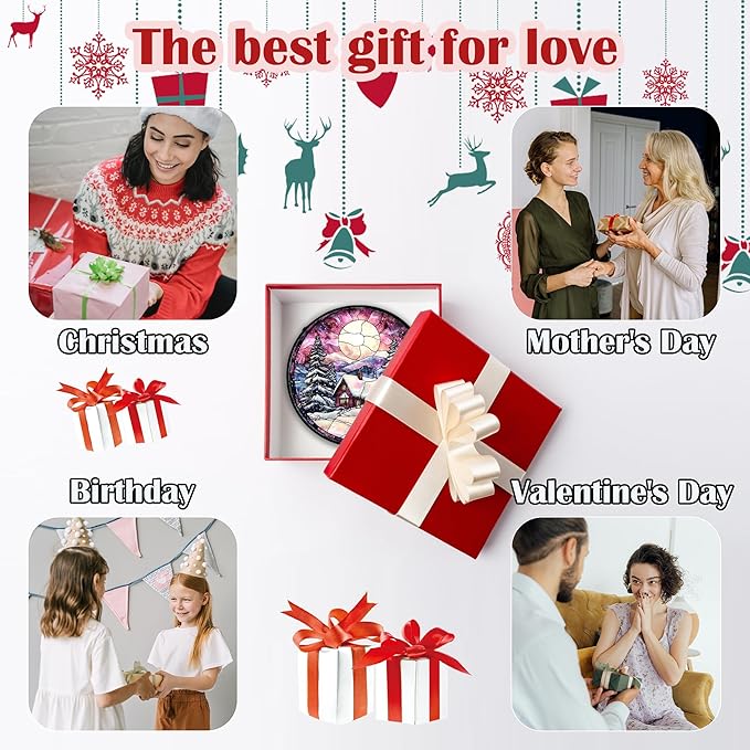 Stained Glass Window Hanging - Winter Snow Scene Cabin Moon Sun Catcher for Door Garden Home Decor Pine Tree Suncatcher Christmas Mother's Day Birthday Gifts for Women Men Mom Nana 9.8 in