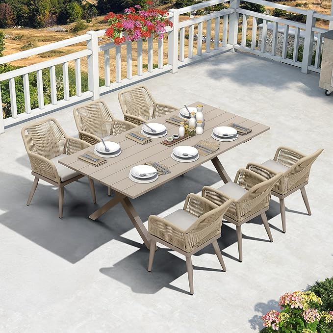 PURPLE LEAF Outdoor Patio Dining Set All-Weather PE Rattan Furniture Set with All Aluminum Frame Rectangular 7 Pieces Table and Chairs Set for 6 People Lawn Garden Backyard Deck, Champagne