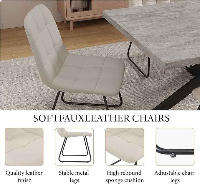 ZckyCine 6-8 Person Modern Rectangular Dining Table Set with 6 Chairs, Expandable Kitchen Table (51 to 63 Inches), Space-Saving Design, Metal Frame, Gray Tabletop & White PU Leather Chairs