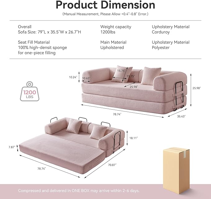 - 【High-quality Material】 Our convertible sleeper sofa bed is made for tactile luxury with premium corduroy fabric, woven for velvety softness. Paired with high-density sponge cushioning, this sofa offers cloud-like support that retains its shape through years of lounging, naps, and playtime.