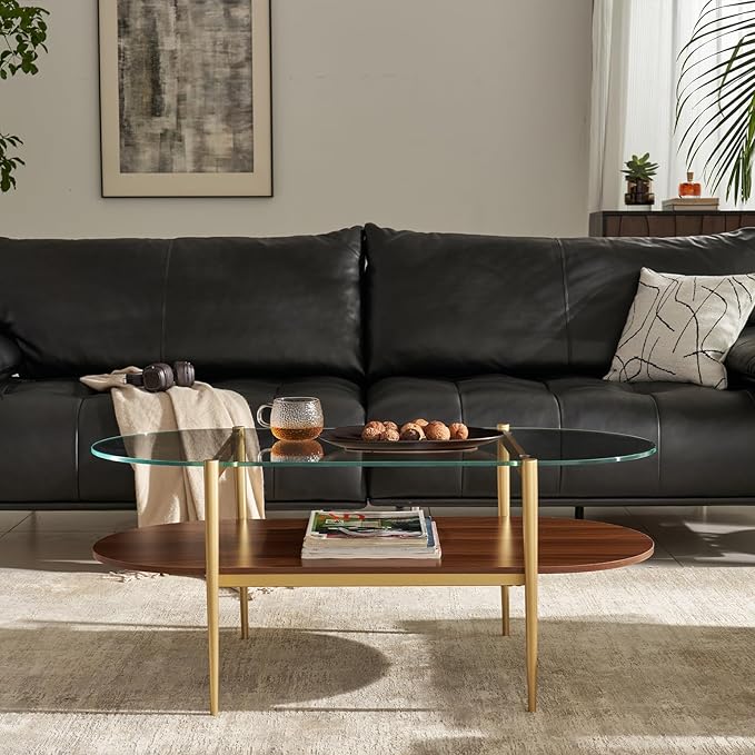 - 【Design and Style】This Mid-Century Modern coffee table boasts a classic oval shape, evoking the sophisticated charm of the Modern Century. The elegant two-tier walnut design provides visual interest and functionality. The clear glass top beautifully showcases the rich brown walnut frame beneath, making it a perfect glass wood coffee table for your home.
