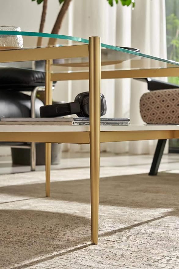 Shrine Oval Coffee Table, Mid-Century Modern Design, 2-Tier Structure, Clear Glass Top and White MDF Shelf, 47" D x 21" W x 17" H, Sleek Conical Metal Legs with Gold Finish