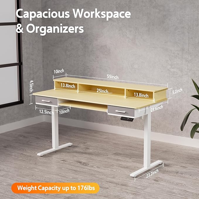 55 Inches Electric Standing Desk with Keyboard Tray, Height Adjustable Sit to Stand Table with 2 Drawers, Ergonomic Home Office Desk with Storage Shelf, Computer Table, Oak