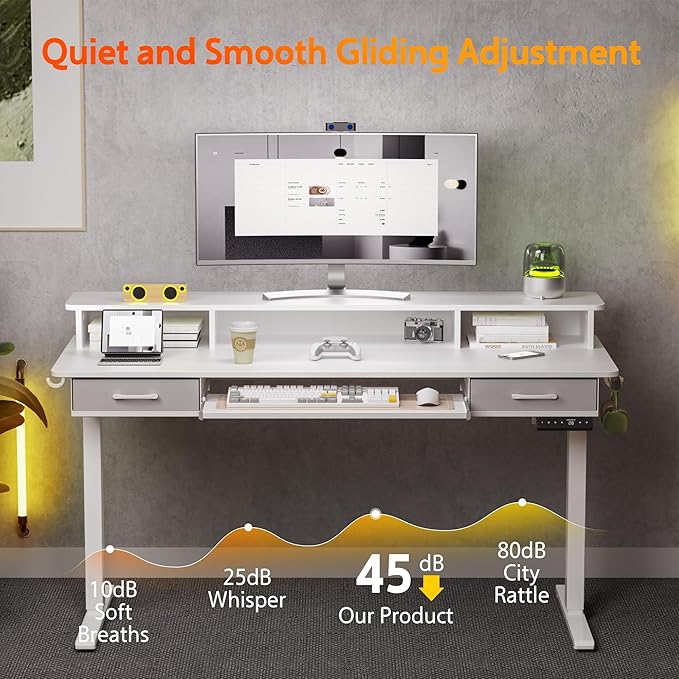 - Electric Lifting System: The sit to stand desk has advanced motor that can support height adjustment between 28.3''-46.5'' with low noise (< 45 dB) while running. The lifting speed is 20mm/s. Switch from sitting to standing in seconds!