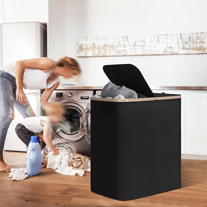 DOKEHOM 160L Double Laundry Basket with Removable Lid and Laundry Bags, Large Collapsible Laundry Hamper with 2 Sections (Black)