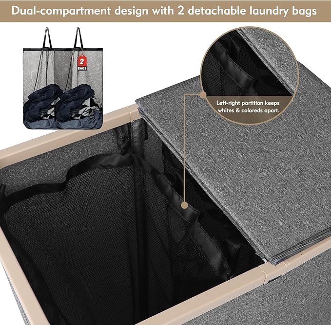 DOKEHOM 160L Double Laundry Basket with Removable Lid and Laundry Bags, Large Collapsible Laundry Hamper with 2 Sections (Grey)