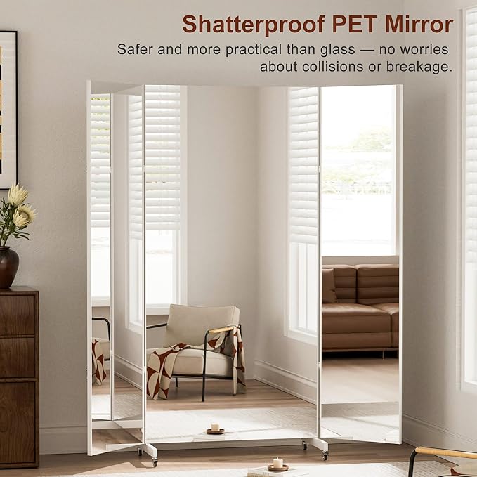 - 【Space-Saving Foldable Design & Full-Body Coverage】Fold the mirror flat against a wall or door in seconds for compact storage. Unfold to reveal a seamless, floor-to-ceiling view—perfect for dance rehearsals, yoga flows, or outfit checks—without permanent installation.