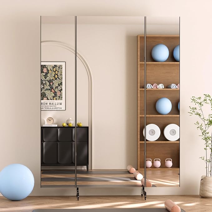 - 【Space-Saving Foldable Design & Full-Body Coverage】Fold the mirror flat against a wall or door in seconds for compact storage. Unfold to reveal a seamless, floor-to-ceiling view—perfect for dance rehearsals, yoga flows, or outfit checks—without permanent installation.