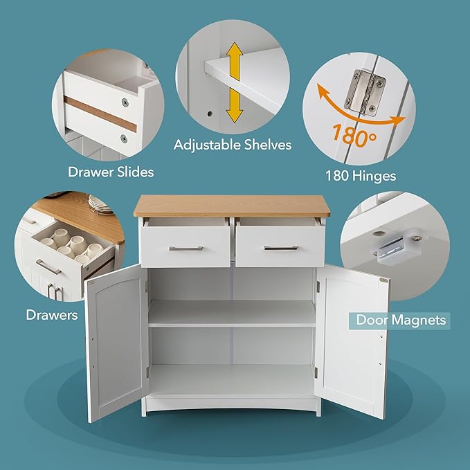 Buffet Cabinet with Storage, Coffee Bar Cabinet 26 x 30 Inches, Oak Top Sideboard Cabinet, Matte White Finish, Anti-Fall Drawers, Arched Doors, Adjustable Shelves