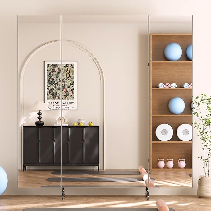 - 【Space-Saving Foldable Design & Full-Body Coverage】Fold the mirror flat against a wall or door in seconds for compact storage. Unfold to reveal a seamless, floor-to-ceiling view—perfect for dance rehearsals, yoga flows, or outfit checks—without permanent installation.