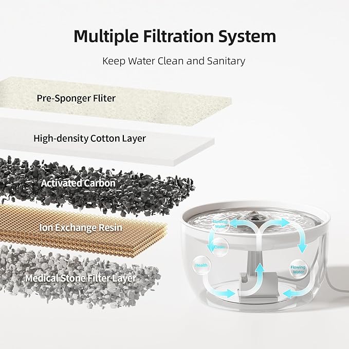 - Quadruple Filtration System: Featuring a 4-layer filtration system with activated carbon, ion resin, high-density cotton, and sponge, this cat water fountain effectively removes impurities, ensuring clean, fresh, and healthy water for your pets.
