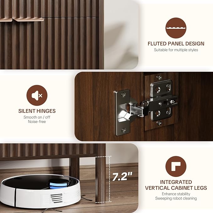 - Elegant Fluted Design: This sideboard features a warm wood tone with beautifully grained textures and vertical grooved panels, creating an inviting atmosphere.The smooth metal handles add a touch of sophistication.It harmoniously complements any decor style—from charming rustic farmhouse to sleek modern minimalist—effortlessly blending into your space.