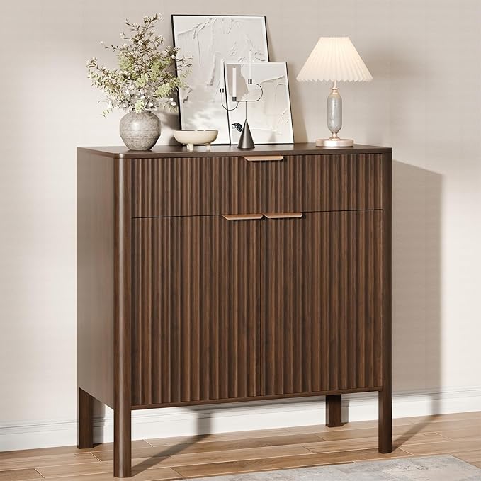 Sideboard Buffet Cabinet with Storage - Modern Fluted Credenza with Doors & Drawer, Accent Cabinet Coffee Table Bar Counter Bookcase for Living Room Kitchen Dining Room Entryway 31" H Walnut