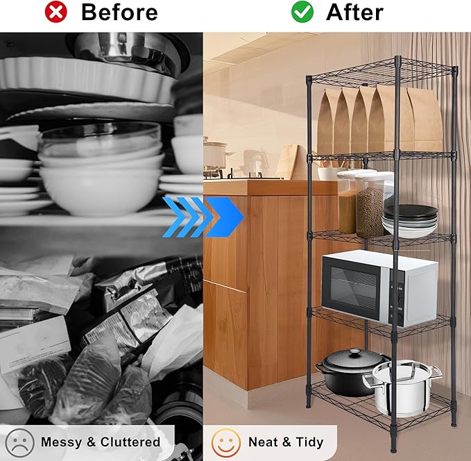 - Easy Assembly: Designed for tool-free assembly, the 5-Tier Metal Storage Rack can be easily installed by aligning plastic clips with grooves on the poles and resting the shelves on the clips. Follow the simple steps to secure all tiers and meet all your storage needs.