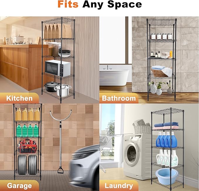 - Multi-Purpose Use: 5-Tier wire shelving (18" L x 12" W x 50" H) fits compact spaces yet holds bulkier items effortlessly. Ultra-narrow spacing secures small tools, plants, or pantry jars without slipping, transforming cluttered corners into organized zones, Ideal for various spaces such as kitchens, bathrooms, garages, and laundry rooms