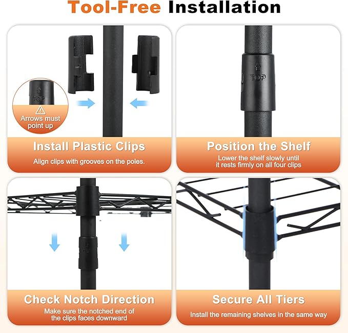- Easy Assembly: Designed for tool-free assembly, the 3-Tier Metal Storage Rack can be easily installed by aligning plastic clips with grooves on the poles and resting the shelves on the clips. Follow the simple steps to secure all tiers and meet all your storage needs.