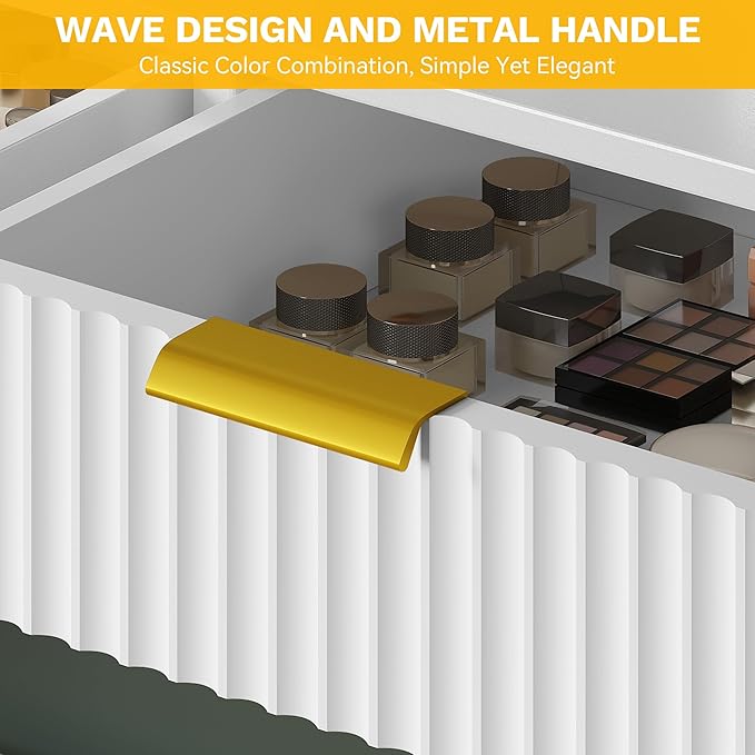 - Wave-inspried Visual Charm: This makeup desk’s fluted panels ripple across the front like gentle waves, giving your bedroom a soft, flowing rhythm. And the golden groove handles add a quiet luxury that feels both thoughtful and elevated
