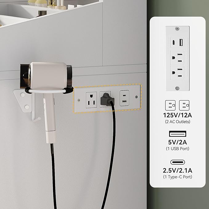 - Easy Charing & Hairdryer Holder: Built-in 2 AC outlets, USB, and Type-C ports let you plug in your devices with ease, while the clever hairdryer holder of white vanity desk keeps your tools off the tabletop and always within reach when you’re styling on the fly