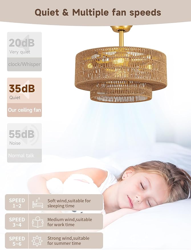 - Experience the comfort of silence: Experience tranquility with our boho rattan ceiling fan that eliminates disruptive audible beeps. The whisper-quiet performance of silent blades and a smooth pure copper motor ensures a noise-free environment. Perfect for those who like to fall asleep with the boho rattan caged ceiling fans with lights flush mount on.